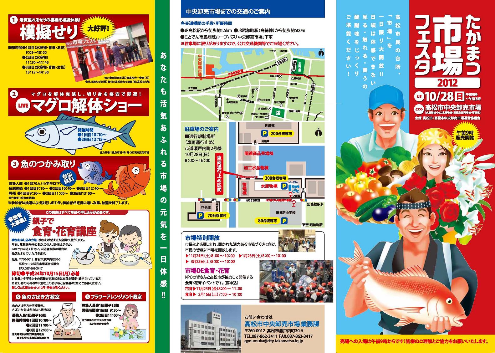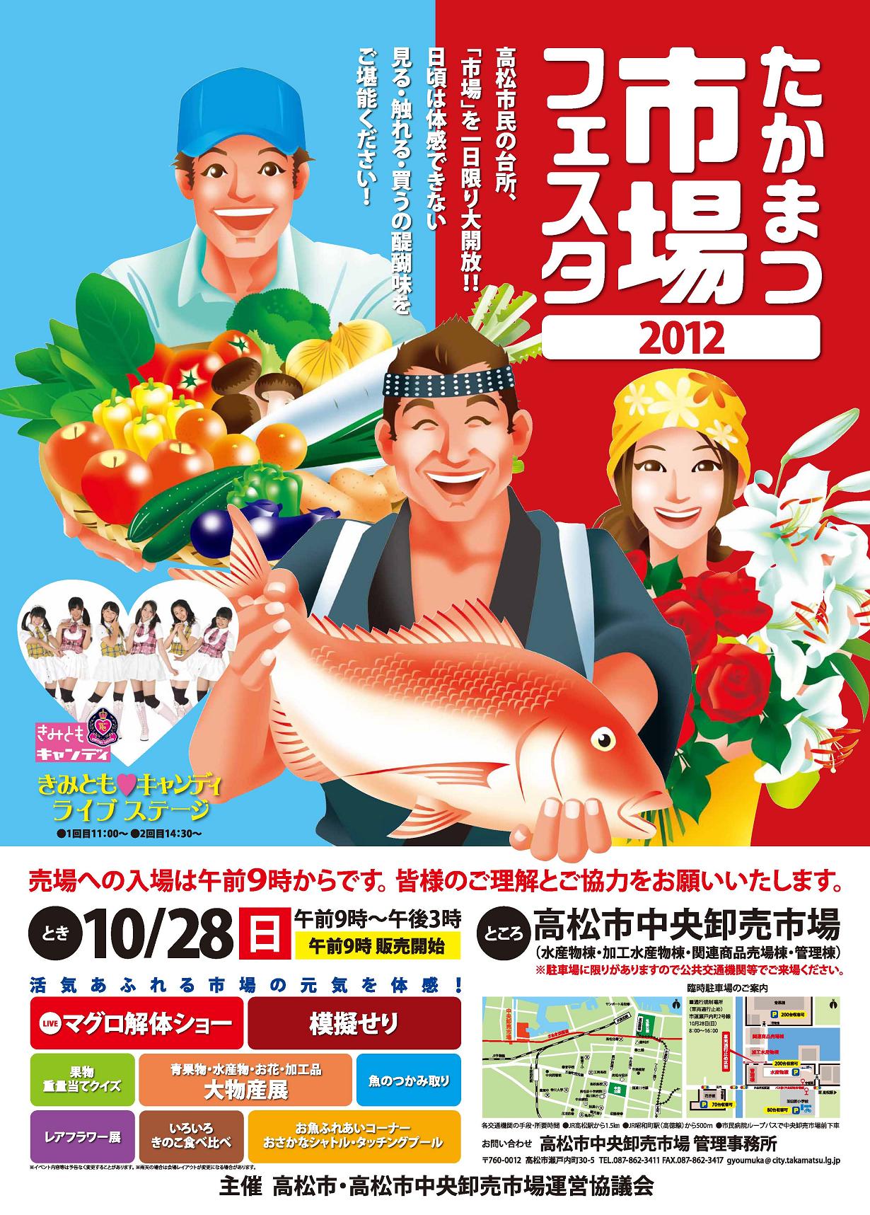 10月28日(日)たかまつ市場フェスタ ツイート シェア 送る はてブ 場所/高松市中央卸売市場(水産物棟・加工水産物棟・関連商品売場棟・管理棟) 時間/1ステージ目 11:00~ , 2ステージ目 14:30~ ※ステージ終了後、グッズ販売あります。 参考サイト http://www.city.takamatsu.kagawa.jp/8878.html