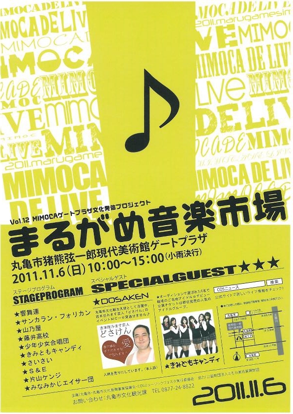 11月6日(日) まるがめ音楽市場 ツイート シェア 送る はてブ 11月6日(日) まるがめ音楽市場 スペシャルゲストとして きみともキャンディが登場! きみともキャンディの登場時間は12:00~12:30の予定 無料で観覧いただけるので是非、見に来てくださいね。 場所:丸亀市猪熊弦一郎現代美術館ゲートプラザ